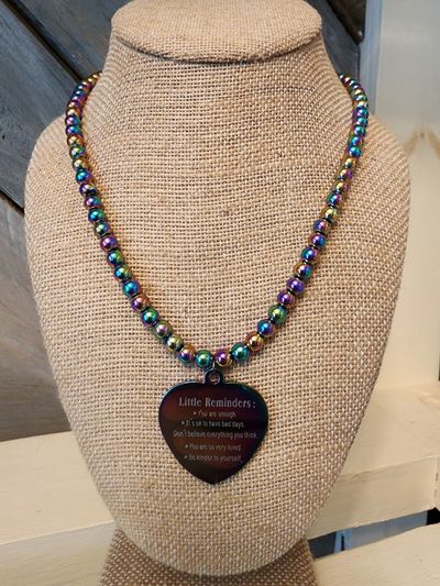 • Materials: Rainbow hematite beads, stainless steel heart pendant